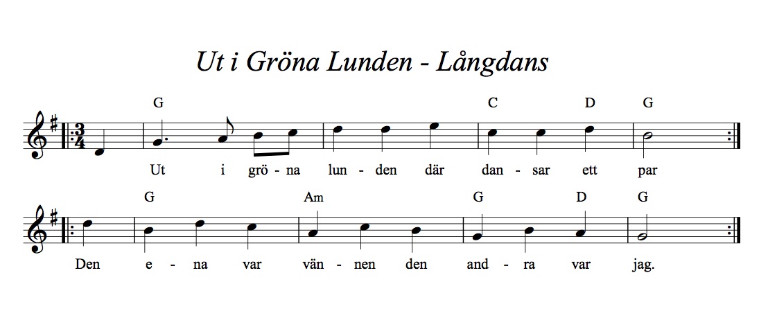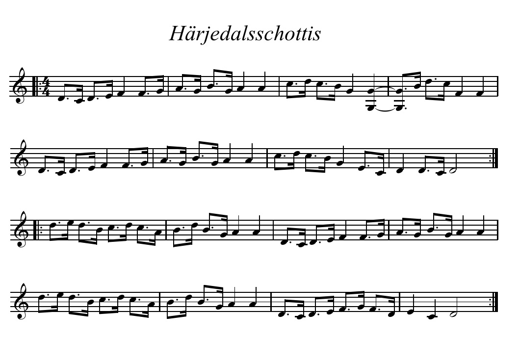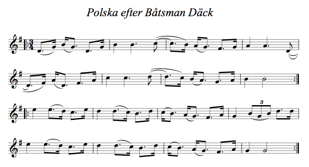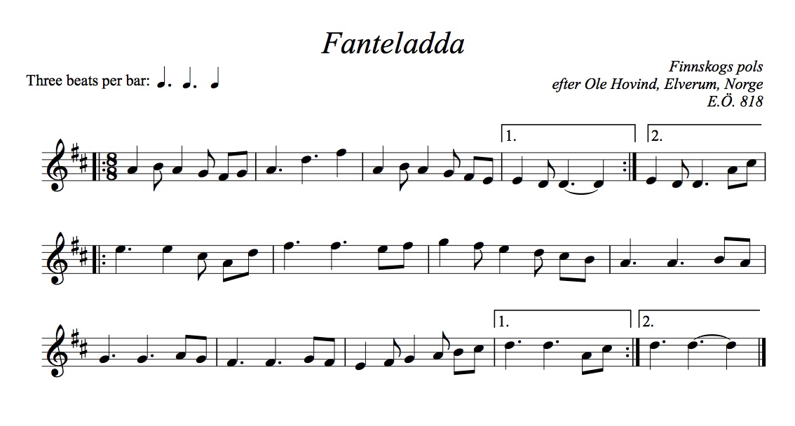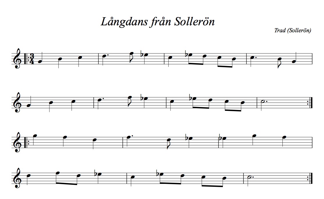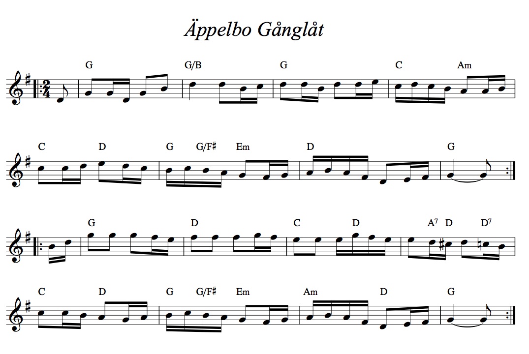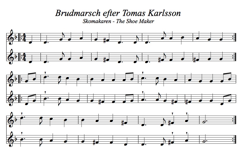 The gånglåt (or walking tune, pronounced, gong lort) is usually played as written, not too fast, not too slow. Sometimes the parts are played through 4 times depending on how they're written out. | |