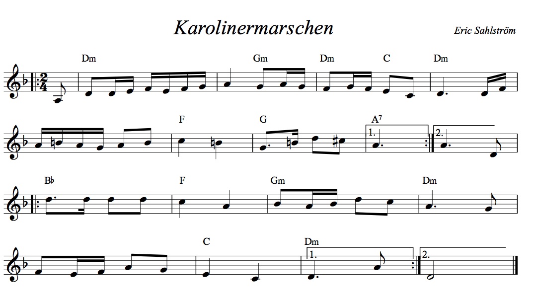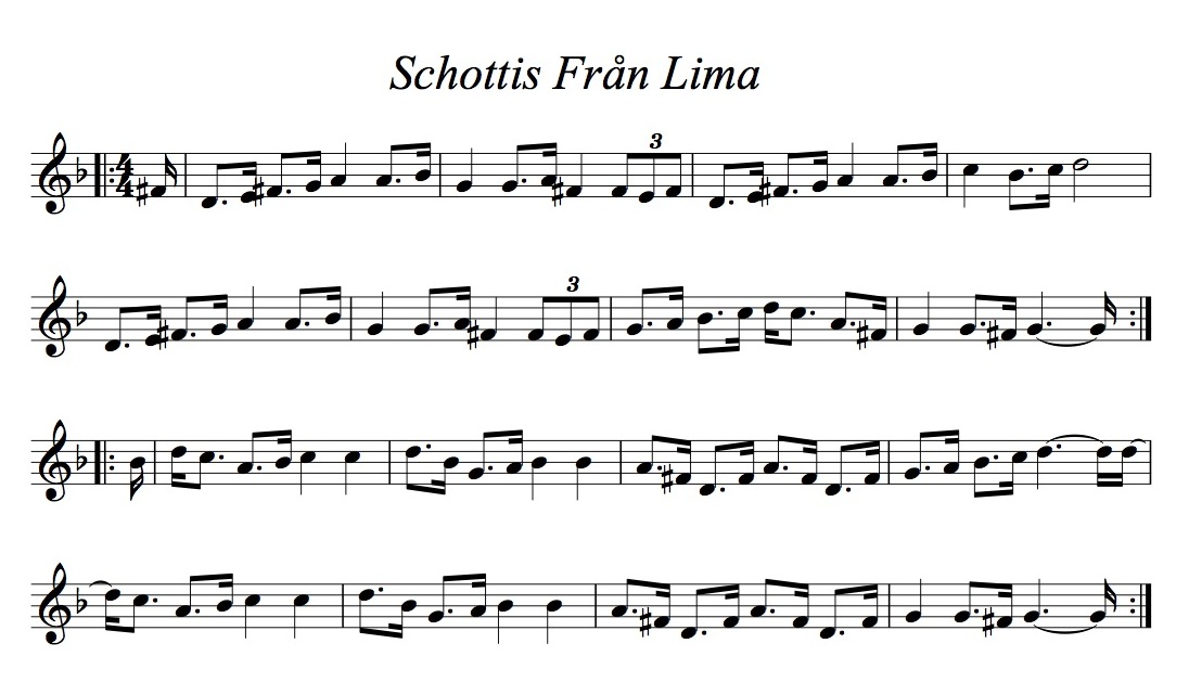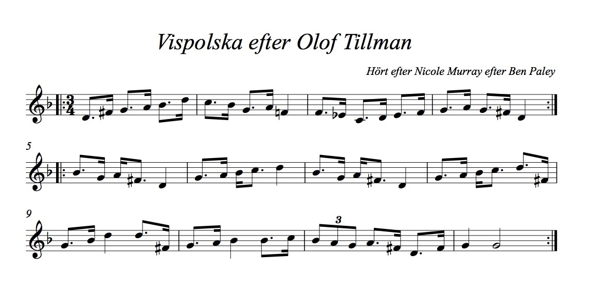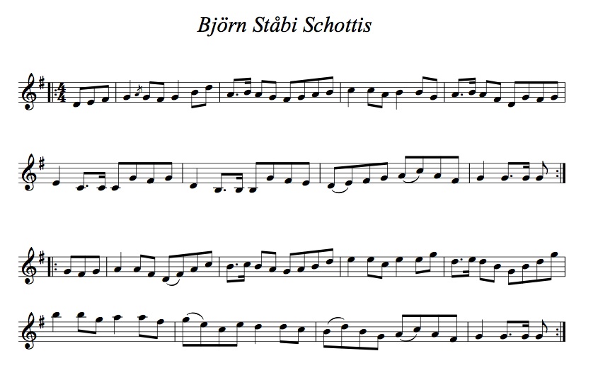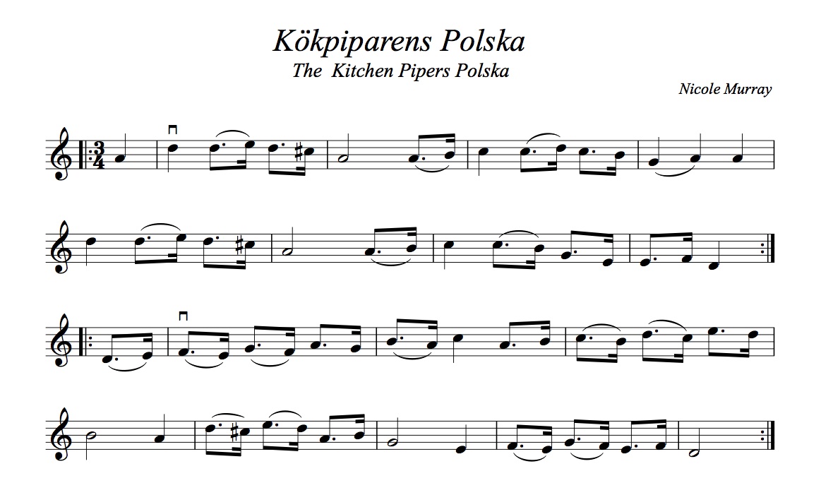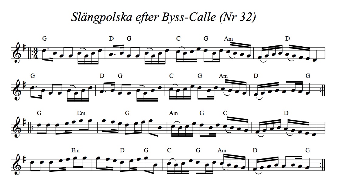 The gånglåt (or walking tune, pronounced, gong lort) is usually played as written, not too fast, not too slow. Sometimes the parts are played through 4 times depending on how they're written out. | |