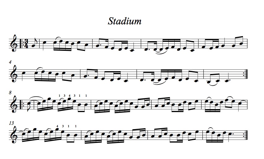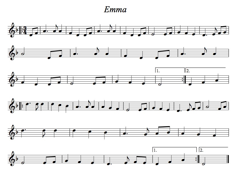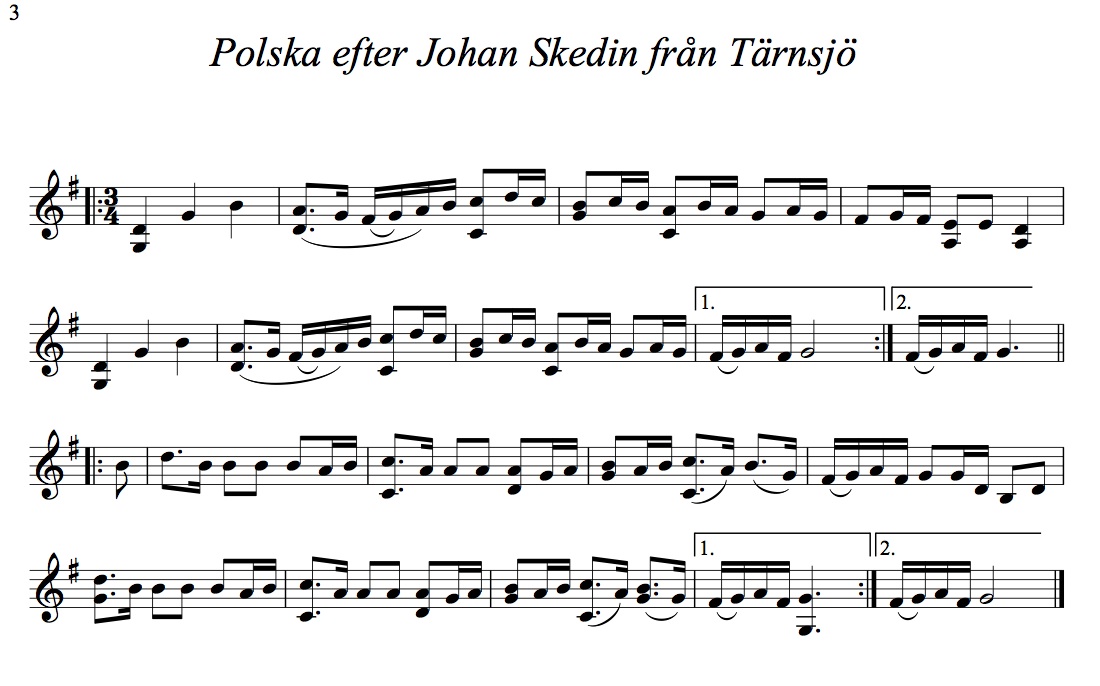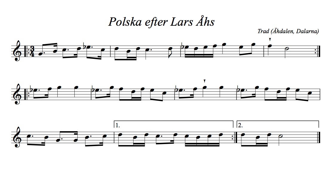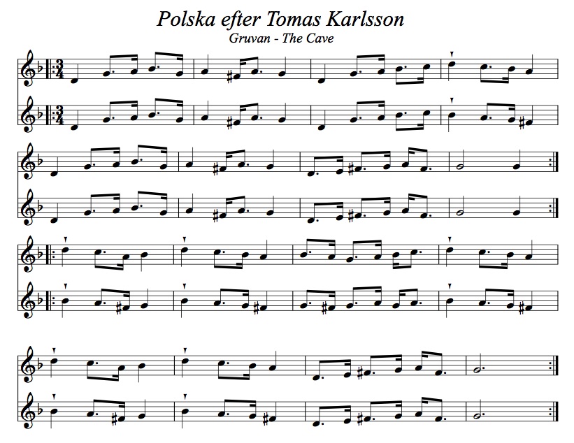 Triplet polskas technically could be written out with a 9/8 key signature. The rhythm is swung with a triplet feel, not unlike in jazz. Often the first note is also played early (called anticipation), this isn't always written in. The strong beats fall on the first and third beat - they are not waltzes, this is really important! The Lars Åhs and Carl Magnusson aren't played in the same key. The soundcloud clip is both Shoemaker and The Cave in Am. |